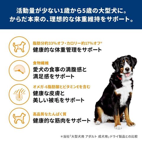 脂肪分約33%オフ・カロリー約17%オフ*で健康的な体重管理をサポート*当社「大型犬用 アダルト 成犬用」ドライ製品との比較
