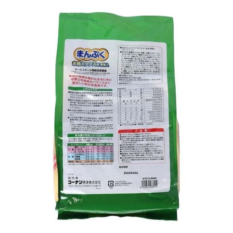 ●保証成分:粗たんぱく質30.0%以上、9.0%以上、6.0%以下、粗繊維6.0%以下、粗灰分8.5%以下、水分10.0%以下、代謝エネルギー約347kcal/100g、カルシウム1.00%以上、リン0.8%以上、ナトリウム0.2%以上、リノール酸0.5%以上、ビタミンA9000lU/kg以上、ビタミンD750lU/kg以上、ビタミンB1 5.0mg/kg以上、ビタミンB2 4.0mg/kg以上、タウリン0.1%以上【備考】