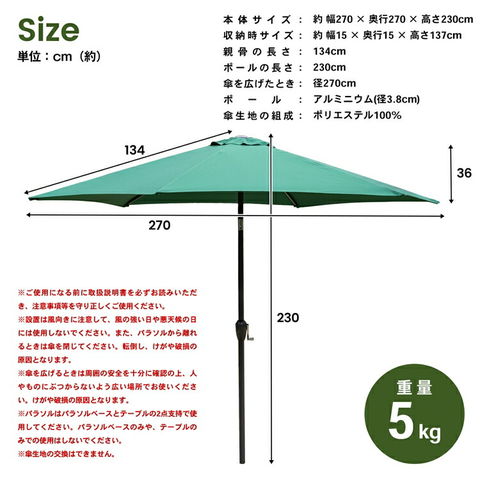 ●サイズ(約):ポールの長さ/2.3m、傘を広げたとき/径2.7m