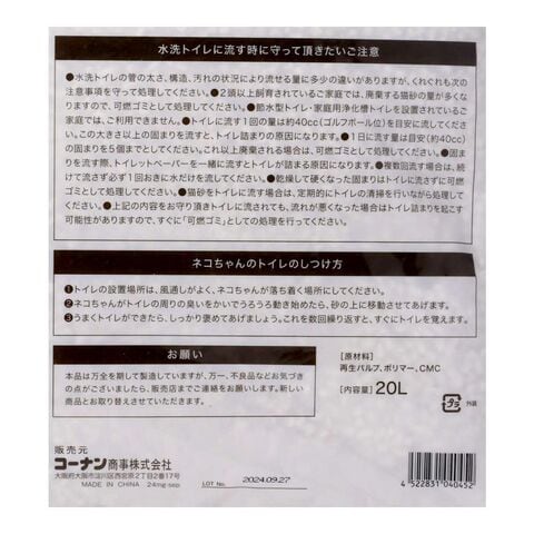 ●本品は再生パルプを使用しておりますので、砂の色が多少異なる場合があります。また、細かい粒や粉が混ざることがありますが、粒がこすれあうことによって発生するもので、品質に問題ありません。まれに黒い毛色のネコちゃんの場合、足が汚れることがあります。汚れがひどい場合はご使用を中止してください。ネコちゃんが本品を口に入れたり、いたずらをする場合や、アレルギーなどの症状を起こす場合にはご使用を中止してください。本品はネコちゃんのトイレの砂以外の用途でお使いにならないでください。