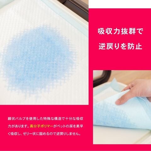 綿状パルプを使用した特殊な構造で十分な吸収力があります。高分子ポリマーがペットの尿を素早く吸収し、ゼリー状に固めるので逆戻りしません。