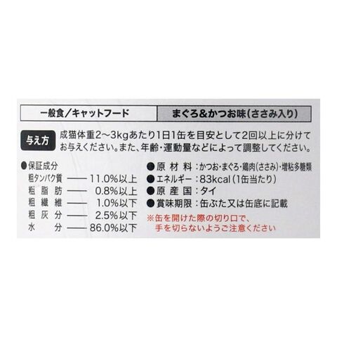 ●与え方 成猫体重2~3kgあたり1日1缶を目安として2回以上に分けてお与えください。 また、年齢・運動量などによって調整してください。