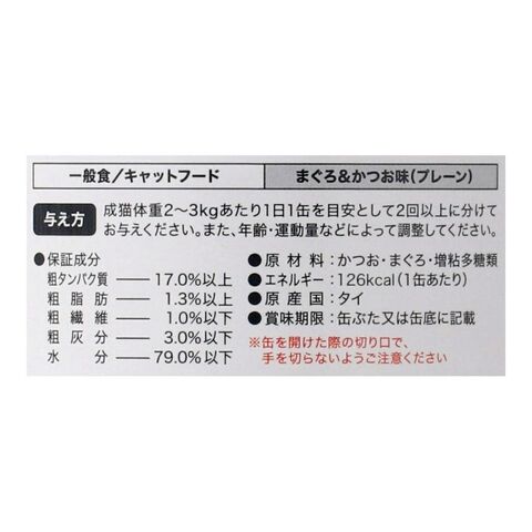 ●与え方 成猫体重2~3kgあたり1日1缶を目安として2回以上に分けてお与えください。 また、年齢・運動量などによって調整してください。