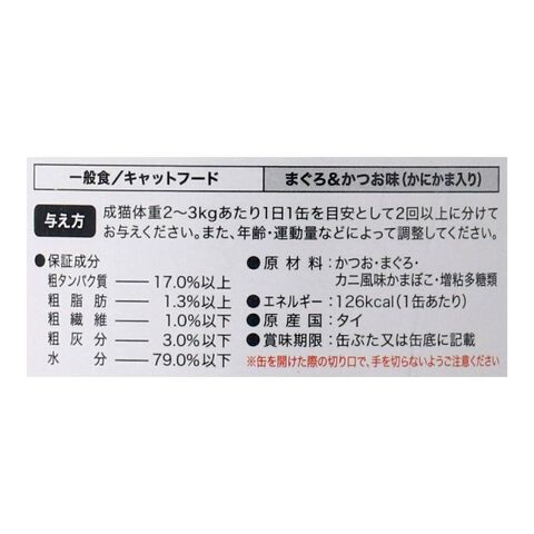 ●与え方 成猫体重2~3kgあたり1日1缶を目安として2回以上に分けてお与えください。 また、年齢・運動量などによって調整してください。