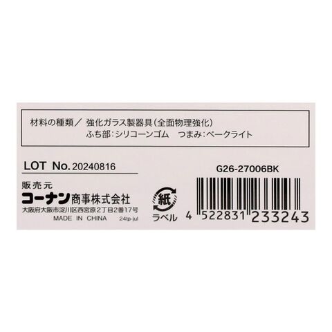 ●材料の種類/強化ガラス製器具(全面物理強化)ふち部:シリコーンゴム/つまみ:ベークライト
