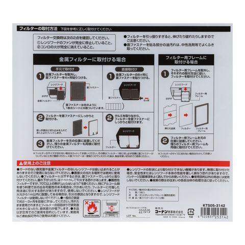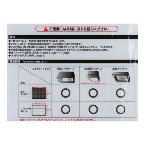 ●難燃性フィルターですが、70℃以上の熱が当たらないようご注意ください。特にアルコール類を使う料理で炎の出る可能性のある場合は、穴があいたり、フィルターに付着した飛沫油に引火する恐れがありますので、使用しないでください。