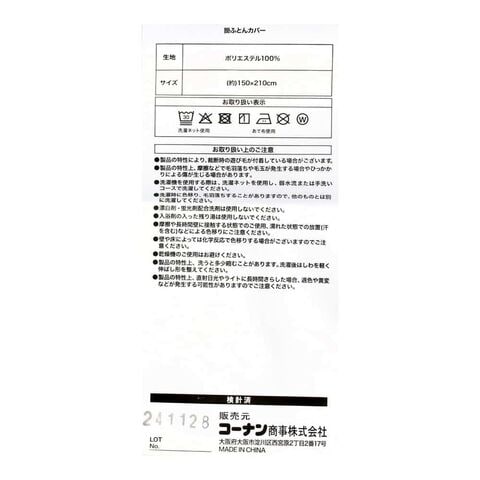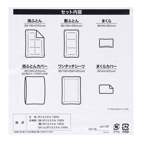 まくら(約40×60cm)、掛ふとんカバー(約150×210cm) 6か所スナップボタン付き