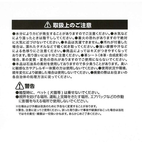 ●革シート(本革・合成皮革)の場合、革の変質・変色の恐れがありますのでご使用にならないでください。