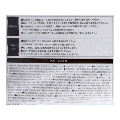 ●本品は再生パルプを使用しておりますので、砂の色が多少異なる場合があります。また、細かい粒や粉が混ざることがありますが、粒がこすれあうことによって発生するもので、品質に問題ありません。まれに黒い毛色のネコちゃんの場合、足が汚れることがあります。汚れがひどい場合はご使用を中止してください。ネコちゃんが本品を口に入れたり、いたずらをする場合や、アレルギーなどの症状を起こす場合にはご使用を中止してください。本品はネコちゃんのトイレの砂以外の用途でお使いにならないでください。