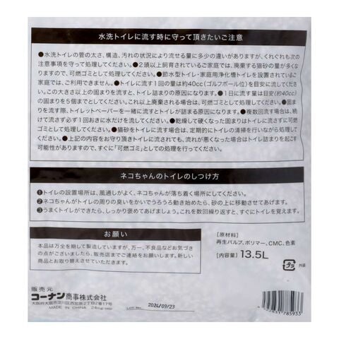 ●水洗トイレの管の太さ、構造、汚れの状況により流せる量に多少の違いがありますが、くれぐれも次の注意事項を守って処理してください。2頭以上飼育されているご家庭では、廃棄する砂の量が多くなりますので、可燃ゴミとして処理してください。節水型トイレ・家庭用浄化槽トイレを設置されているご家庭では、ご利用できません。トイレに流す1回の量は約40cc(ゴルフボール位)を目安にしてくださこの大きさ以上の固まりを流すと、トイレ詰まりの原因になります。