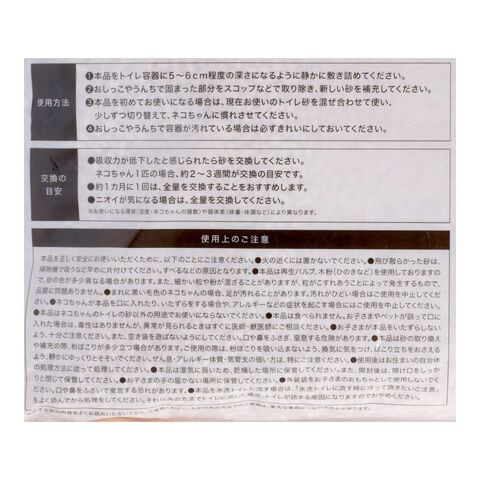 ●本品は再生パルプ、木粉(ひのきなど)を使用しておりますので、砂の色が多少異なる場合があります。また、細かい粒や粉が混ざることがありますが、粒がこすれあうことによって発生するもので、品質に問題ありません。まれに黒い毛色のネコちゃんの場合、足が汚れることがあります。汚れがひどい場合はご使用を中止してください。ネコちゃんが本品を口に入れたり、いたずらをする場合や、アレルギーなどの症状を起こす場合にはご使用を中止してください。