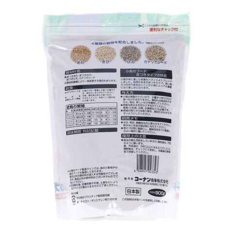●皮つきあわ、皮つききび、皮つきひえ、皮付カナリヤシードを配合し窒素ガス充填により穀虫の発生やカビの発生を予防しています。