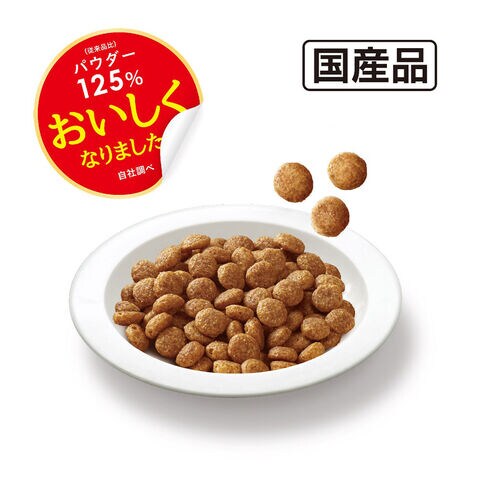 ●成分:穀類(とうもろこし、コーングルテンミール)、肉類(ミートミール、チキンレバーパウダー)、豆類(おから)、油脂類(動物性油脂、フィッシュオイルパウダー:DHA・EPA源、ガンマ-リノレン酸)、セルロース、魚介類(フィッシュミール、フィッシュエキス)、糖類(フラクトオリゴ糖)、卵類(ヨード卵粉末)、シャンピニオンエキス、グルコサミン、ビール酵母、ビタミン類(A、D3、E、K3、B1、B2、パントテン酸、ナイアシン、B6、葉酸、ビオチン、B12、コリン、イノシトール)、ミネラル類(カルシウム、リン、ナトリウム、カリウム、塩素、鉄、コバルト、銅、マンガン、亜鉛、ヨウ素)、アミノ酸類(メチオニン、タウリン、トリプトファン)、酸化防止剤(ローズマリー抽出物、ミックストコフェロール)