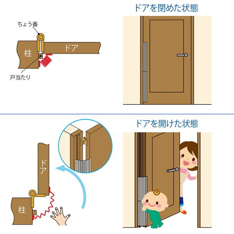 ●ドアを開けた際に生じるすき間をカバーしドアと柱の間に指を挟む事故を防ぎます。