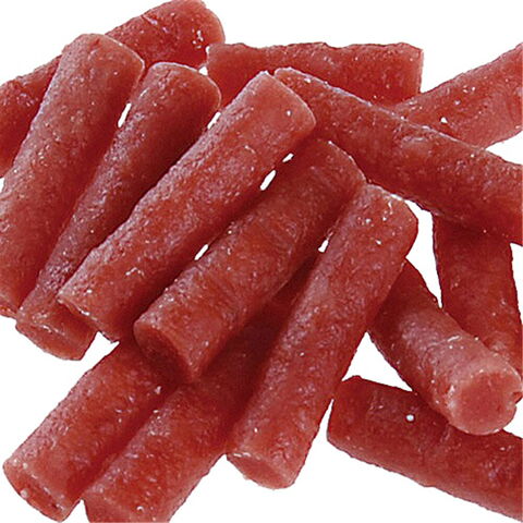●原材料:肉類(牛肉、生ゼラチン)、大豆たん白、パン粉、小麦粉、糖類、植物油脂、グリセリン、ソルビトール、プロピレングリコール、ミネラル類(ナトリウム)、保存料(ソルビン酸、デヒドロ酢酸ナトリウム)、くん液、ポリリン酸ナトリウム、発色剤(亜硝酸ナトリウム)、酸化防止剤(ビタミンE)、着色料(赤106)