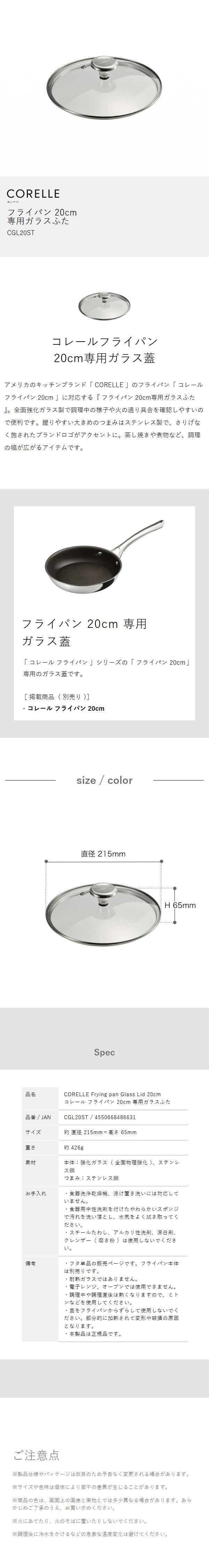 [ Corelle ガラスふた 20cm ]コレール フライパン 20cm 専用ふた 蓋 フタ ふた ガラス蓋 ガラスフタ 中身が見える フライパン用 フライパン蓋 フライパンカバー 調理器具 キッチン用品 強化ガラス キッチンツール 料理道具 シンプル CGL20ST