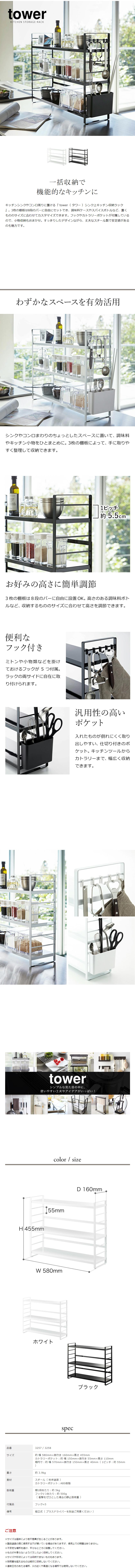 [ シンク上キッチン収納ラック タワー ]山崎実業 tower キッチン 収納 ラック シンク上 スリム 調味料 フック 棚 幅58 ストッカー 台所 キッチンツール 省スペース 整理 おしゃれ シンプル モノトーン yamazaki タワーシリーズ 公式