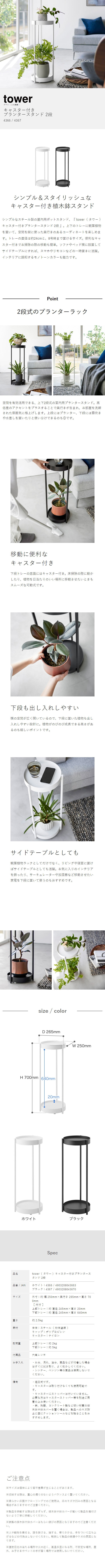 [ キャスター付きプランタースタンド タワー 2段 ] 山崎実業 tower プランターラック 園芸ラック フラワースタンド ガーデンラック 鉢置き 観葉植物 花台 8号鉢 丸型 円型 サイドテーブル 北欧 おしゃれ yamazaki 公式