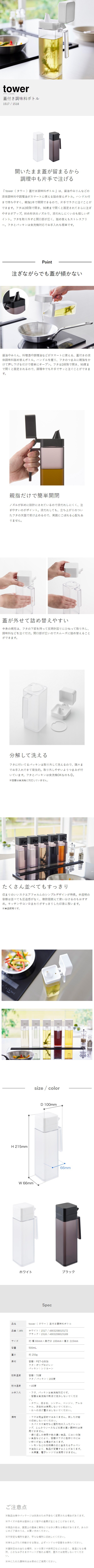 [ 蓋付き調味料ボトル タワー ]山崎実業 tower 調味料入れ オイルボトル 注ぎやすい 醤油差し オイル入れ オリーブオイル ドレッシング 醤油 みりん 醤油さし 液だれ 詰め替え キッチン 収納 おしゃれ yamazaki 公式 モノトーンのレビュー