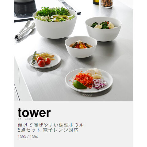 [ 傾けて混ぜやすい調理ボウル タワー 5点セット 電子レンジ対応 ]山崎実業 tower ボウル 耐熱 レンジok レンジ対応 食洗器対応 耐熱ボウル 蓋 フタ 皿 温野菜 どんぶり 丼 鉢 アウトドア 北欧 おしゃれ yamazaki 公式 モノトーン
