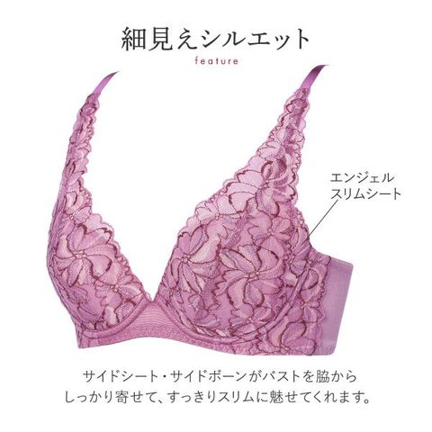 外側と肌側で硬さの異なる二層構造の素材、「エンジェルスリムシート」をカップサイドに使用。バストの横広がりを防いで、すっきりと見せます。