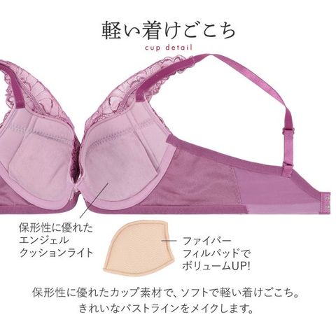 保形性に優れたカップ素材、「エンジェルクッションライト」を使用。ソフトで軽い着けごこちでありながら、きれいなバストラインをメイクします。ファイバーフィルパッドで、ボリュームもアップ。フロント中心部分のワイヤーを薄くフラットにし外側に反らせた「NEWエンジェルワイヤー」仕様なので、肌にくいこみにくいです。