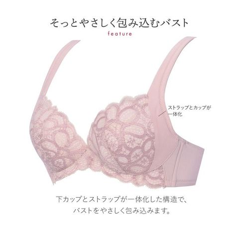 カップ下部とストラップが一体化した構造なので、バストをそっとやさしく包み寄せます。カップと前ストラップ、土台部分に、やわらかく肌ざわりの良いポリウレタンシートを使用しています。ストレッチ性もあり、やわらかくフィットします。