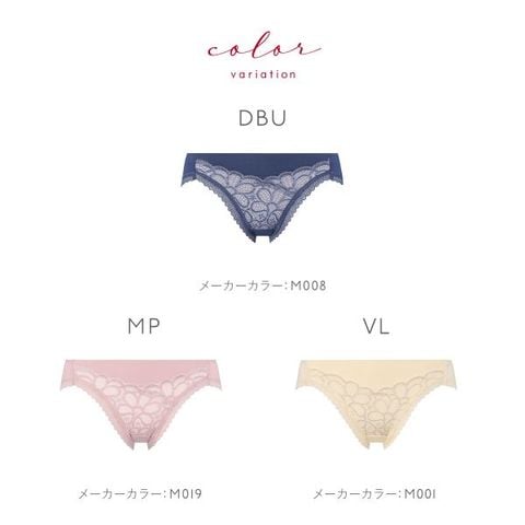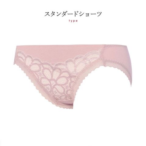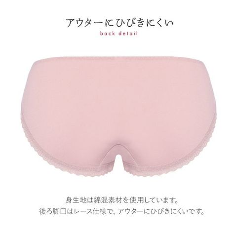 身生地は綿混素材を使用しています。後ろ脚口のレースは、裏マイクロファイバー糸づかいで柔らかな肌ざわりです。前後脚口はレース仕様で、アウターにひびきにくく、くいこみにくいです。