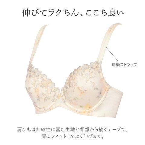前中心部のワイヤーを薄くフラットにし外側に反らせたNEW「エンジェルワイヤー(R)」仕様のため、肌にくいこみにくく痛くなりにくいです。背部下辺はフラットな仕様で、アウターにひびきにくくなっています。
