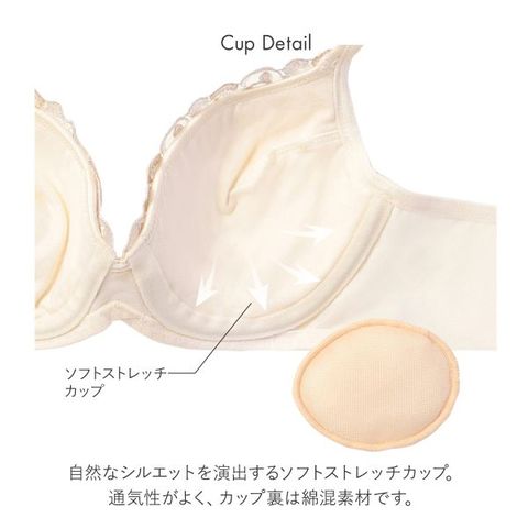 カップは、体の動きにぴったりフィットし、自然なシルエットを演出する恋するブラ独特のソフトストレッチカップ。カップ裏は綿混素材で、カップ下部にホールがあるので通気性がよいです。軽くて通気性の良いファイバーフィルパッドで、ナチュラルにボリュームアップします。