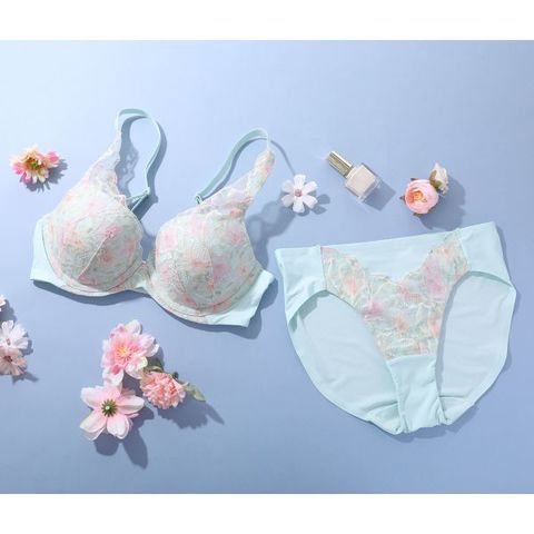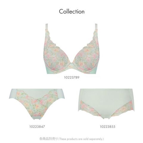 つけていないような着けごこちでバストシルエットを整えるコンフォートワイヤーブラ。アウターに響きにくいフラットレースに華やかな花柄のプリントをのせました。