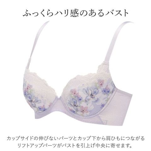 カップサイドの伸びないパーツとカップ下から肩ひもにつながるリフトアップパーツがバストを引上げ中央に寄せるので、ふっくらハリ感のあるバストラインを作ります。