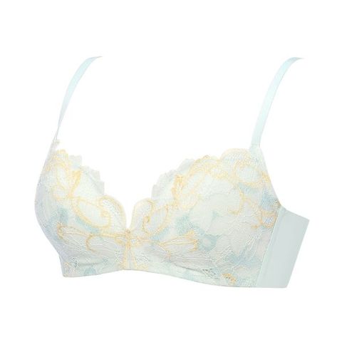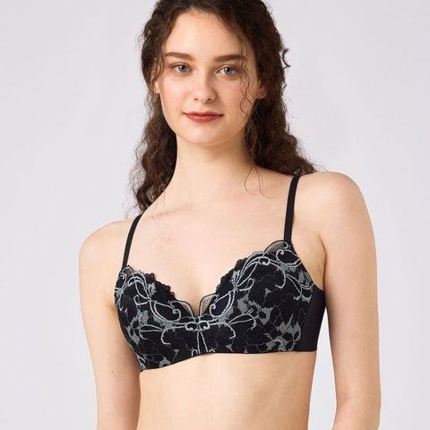 クレマチスの花をモチーフにした編みレースをバスト部分に使用した、ノンワイヤーだけどきれいなバストシルエットに見えるデザイン。