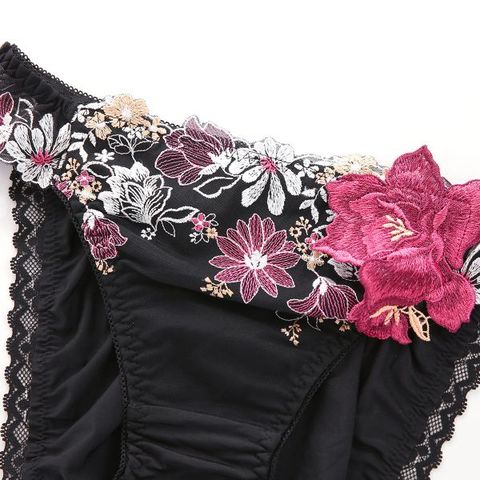 繊細な刺繍レースを贅沢にあしらったノーマルショーツ。サイドは透け感を残した刺繍レースにアップリケを重ね、ウエストラインを華やかで愛らしく飾ります。