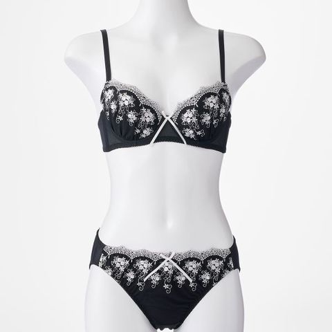 クラシカルな小花&アーチ刺繍が愛らしく上品なブラセット。足長のサテンリボンをあしらい、可憐に仕上げています。