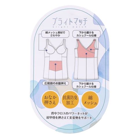 | 仕 様 | ・カップ付き ・アンダーゴムなし ・パッドポケットなし ・ワイヤーなし ・サイドボーン:なし ・肩紐調節:不可 ・肩甲骨サポート ・おなかおさえ ・着用感ソフト ・背中・おなかスムージング ・高通気綿メッシュ |