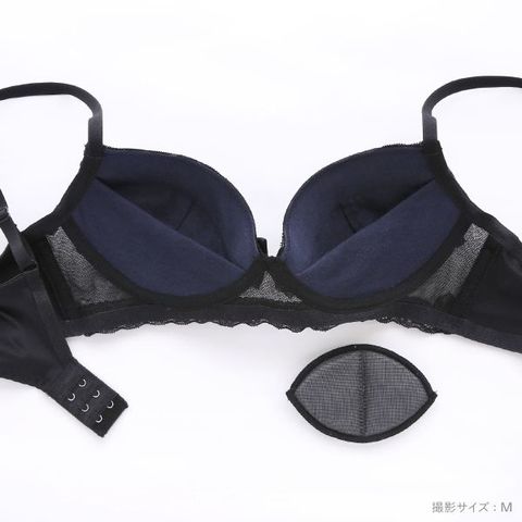 ブラは薄手のカップがバストに優しく寄り添うやわらか設計。肌あたりのやわらかなハンモックパネルと、取り外し可能な不織布パッドがバストをふんわり押し上げ、自然できれいな谷間をメイクします。