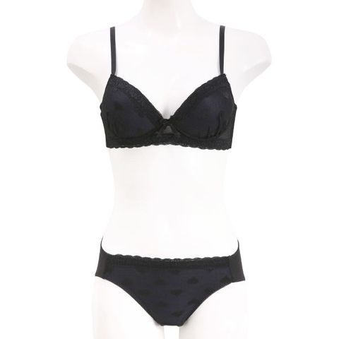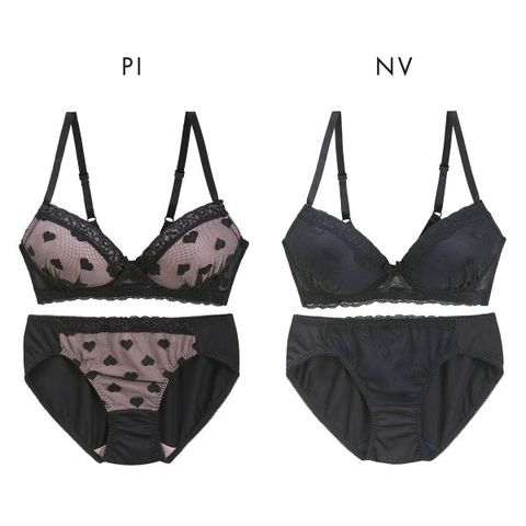 ノンワイヤーの快適さに、機能もセクシーさも両立できるノンワイヤーブラセット★ハート柄がラブリーなブラックチュールをカラーカップにのせた、甘セクシーでキュートなデザイン。