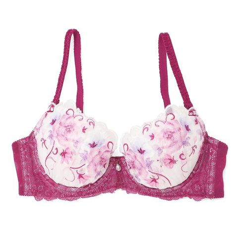 レースの流れのあるスカラップに合わせて、カラフルなお花のプリント柄をのせた、エレガントなブラジャー。土台に重ねたストレッチレースは、カップ部分のレースと同系色を選び、華やかながらも落ち着いた印象に。