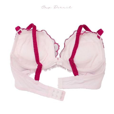 カップパターンは、丸みの綺麗なシルエットを演出するモールドカップを使用。カップ底に厚みを持たせた内蔵パッドと、取り外し可能なパッドのダブル効果で、バストを自然にボリュームアップさせてくれます。前中心は浅めで、ワイヤーの圧迫感が少ないのも嬉しいポイント。