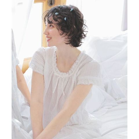 トップスは、襟まわり、袖口、裾までレースをあしらった、ブラウスのようなフェミニンなデザイン。ウエストラインをシャーリングゴムと襟まわりのギャザーでふわっと仕上げています。シャーリングゴムは、ウエストにフィットしないゆるやかなサイズ感で、ジャストウエストよりやや上に施すことで、裾のフレア感を引き立てています。