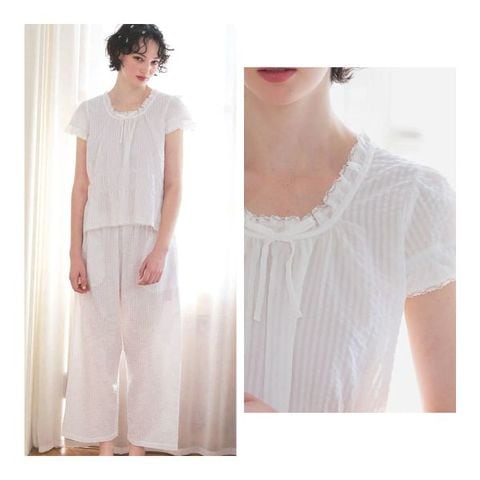 肌離れがよくサラッとしたさわやかな風合いが特徴の、コットンサッカー素材で仕立てたセットアップ。自然な凹凸感を出した生地が、体のラインや透け感もさりげなくカバーしてくれます。
