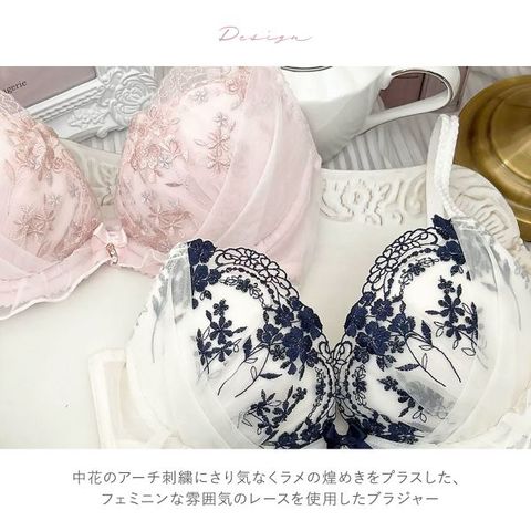 中花のアーチ刺繍にさり気なくラメの煌めきをプラスした、フェミニンな雰囲気のレースを使用したブラジャー。
