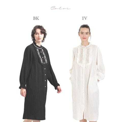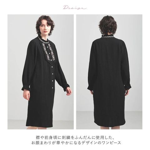 襟や前見頃に刺繍をふんだんに使用した、お顔まわりが華やかになるデザインのワンピース。
