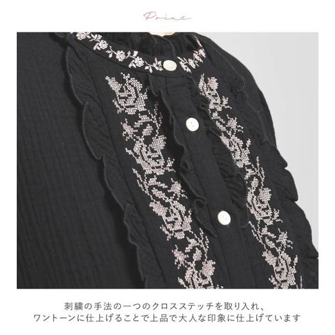 刺繍は、ヨーロッパから全世界に広がった古く幅広い歴史を持つ刺繍の手法の一つのクロスステッチを取り入れ、刺繍をワントーンに仕上げることで上品で大人な印象に仕上げています。