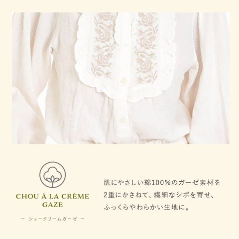 柔らかな綿100%のダブルガーゼに繊細なシボを寄せたナルエーのオリジナルのシュークリームガーゼ(R)素材で仕立てたパジャマ。生地に空気を含んだような、ふわっと包み込むような柔らかさが魅力です。
