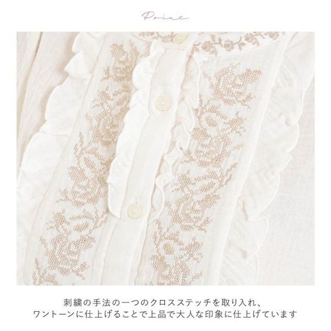 刺繍は、ヨーロッパから全世界に広がった古く幅広い歴史を持つ刺繍の手法の一つのクロスステッチを取り入れ、刺繍をワントーンに仕上げることで上品で大人な印象に仕上げています。