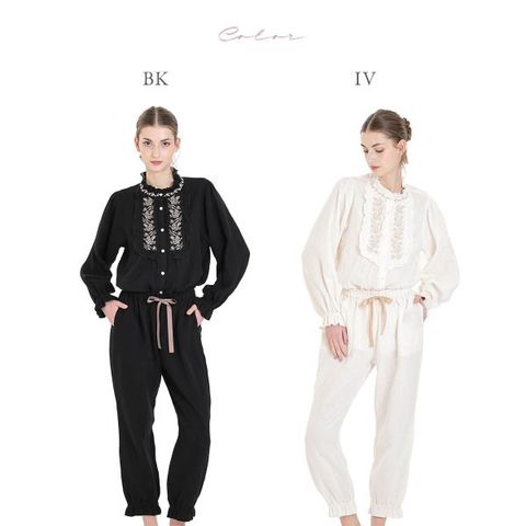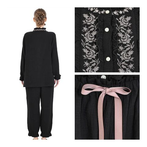 トップスは、襟や前見頃に刺繍をふんだんに使用し、お顔まわりが華やかになるデザイン。