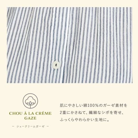 身生地は、柔らかな綿100%のダブルガーゼに繊細なシボを寄せたナルエーのオリジナルのシュークリームガーゼ(R)素材。生地に空気を含んだような、ふわっと包み込むような柔らかさが魅力です。