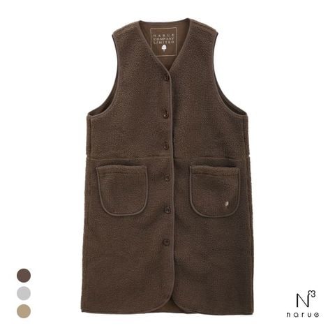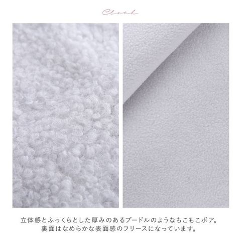 身生地は、ナルエーのロングセラー商品「フリースボア」で培ったボンディング技術を使用した新素材の「プードルフリース」。表面が、立体感とふっくらとした厚みのあるプードルのようなもこもこボアになっており、アウターライクにご着用いただけます。